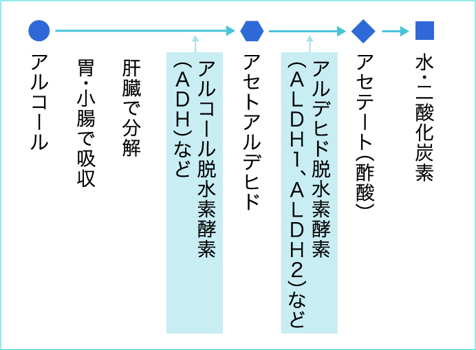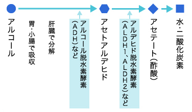 血液が肝臓に入るとアルコールは分解され、アセトアルデヒド、アセテート(酢酸)となり、再び血液にのって全身をめぐり、筋肉や組織で水と二酸化炭素まで分解されて体外に排出されます。